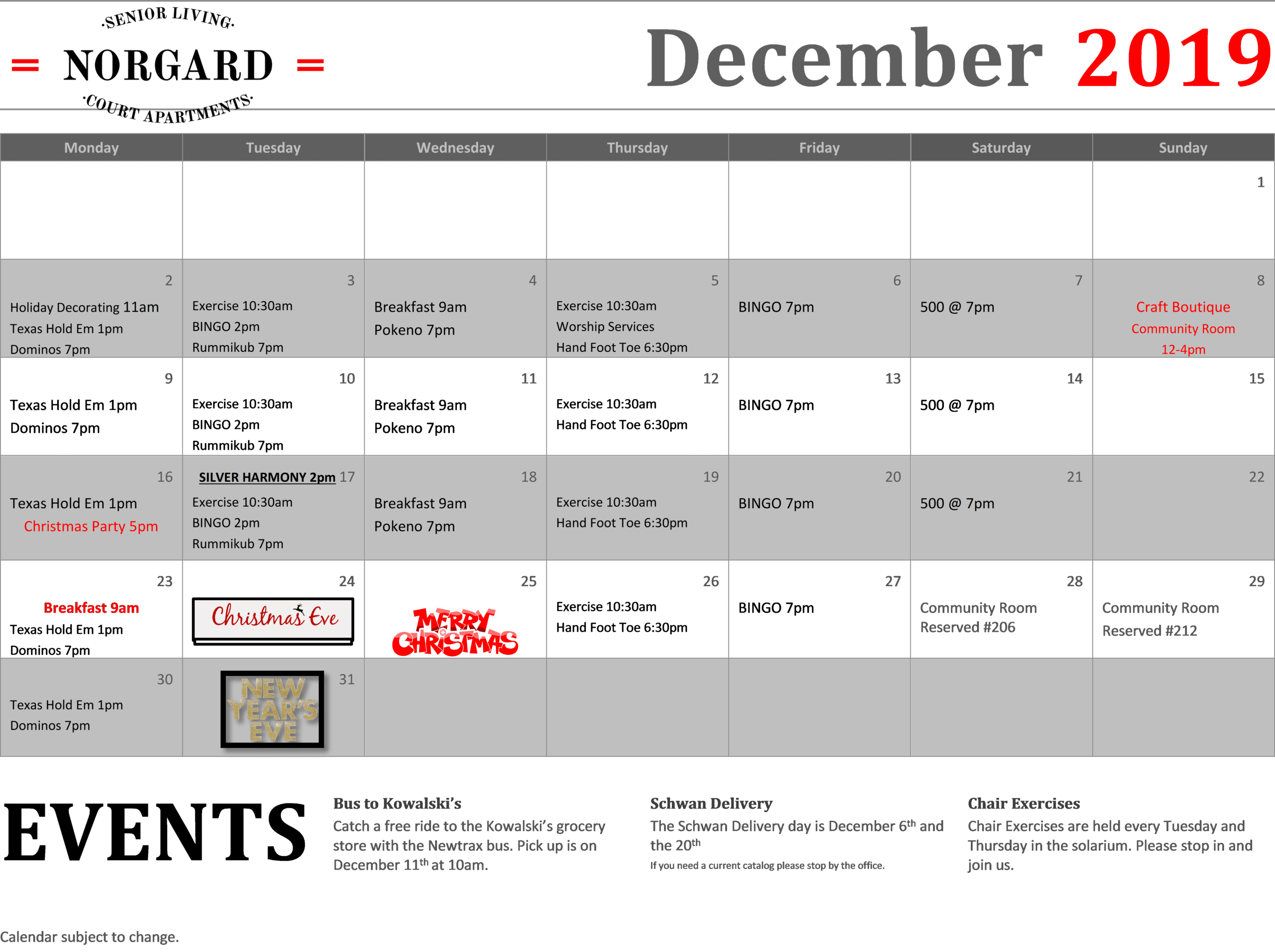 December 2019 Event Calendar
